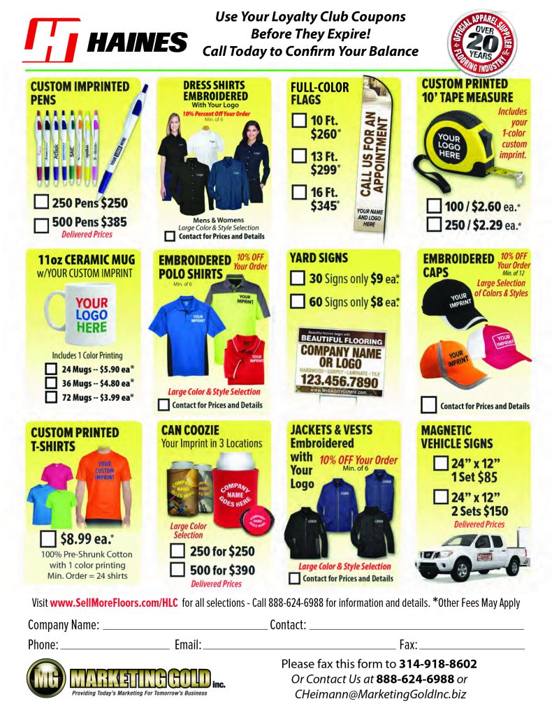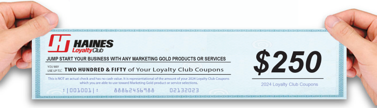 Call or Email Us Today to Verify Your Haines Loyalty Club Coupons Before They Expire! 888-624-6988 Sales@MarketingGoldInc.Biz For More Product or Pricing Information Complete the Contact Form Below and We’ll Reply ASAP! Click Here To Download The Order Form Click Here to See Our Full Line of Products Designed to Help You Market Your Services Please enable JavaScript in your browser to complete this form.Name *Email *PhonePlease explain how we can help you.Submit